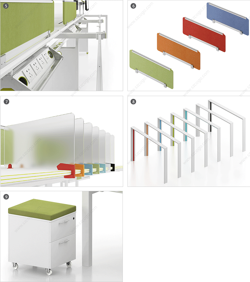 1、桌面屏风,多种选择:板材、玻璃、亚克力、吸音板、多功能挂槽。 2、超人性化设计,多功能挂件,收纳无处不在。
