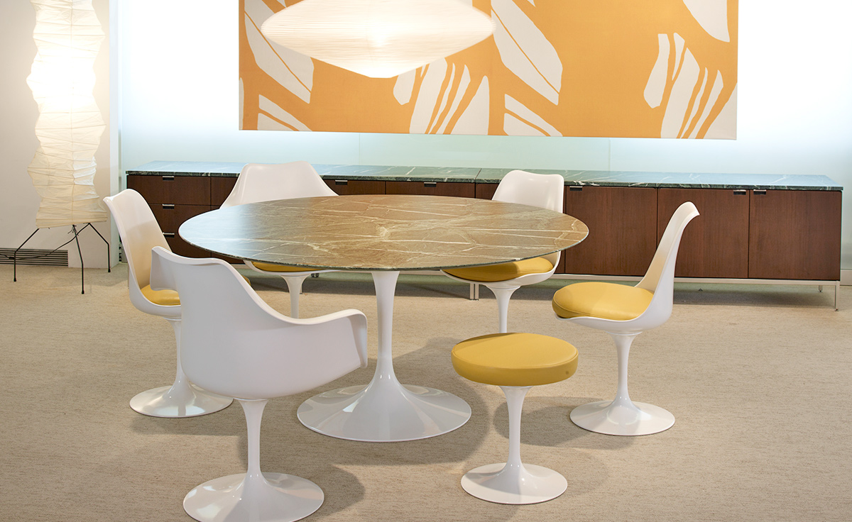 沙里宁郁金香扶手椅设有铸铝底座。外壳是用增强玻璃钢材料完成。座垫是可以可拆卸更换的,有拉链锁扣。