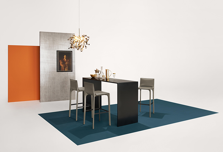吧椅和标准椅都是鞍椅系列的延伸。它们遵循优雅的刚毅形状设计理念,将皮革片进行切割,边缘抛光和染色,再通过精密的缝合绘制。
