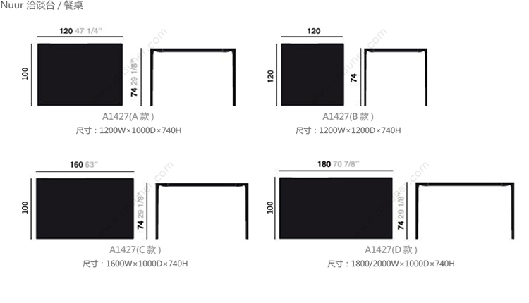 Nuur 洽谈台/餐桌 系列尺寸/示意图