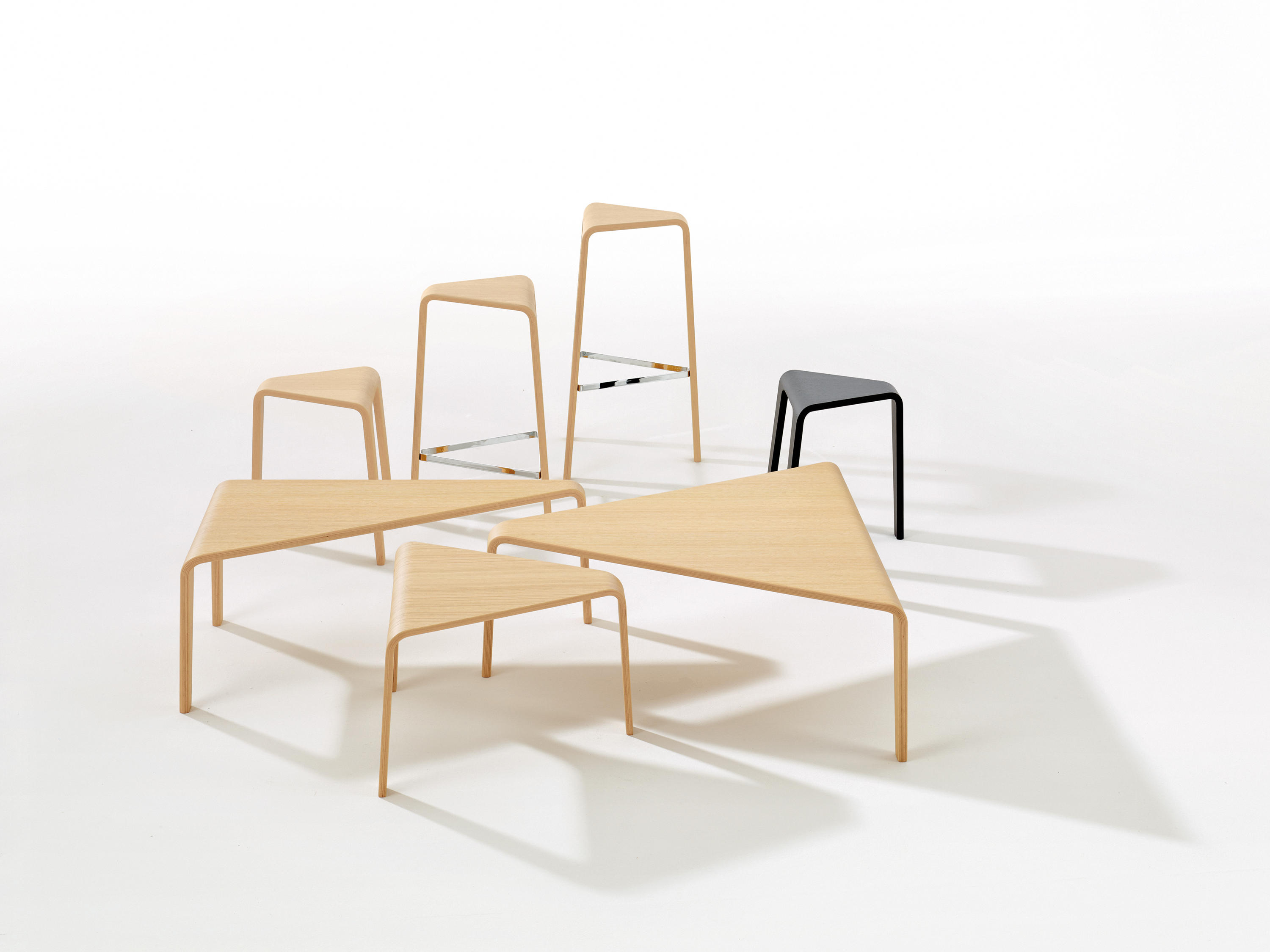 Ply采用三角形和模块化设计,是一种低矮的桌子和凳子系统,采用流畅的木线条。 其设计旨在创造从顶部到腿部的连续线条,其减少的轮廓和温暖的材料与其动态形状相得益彰。 单独或成组,Ply的俏皮几何表面就像七巧板的游戏,形状和颜色共同创造开放的构图。