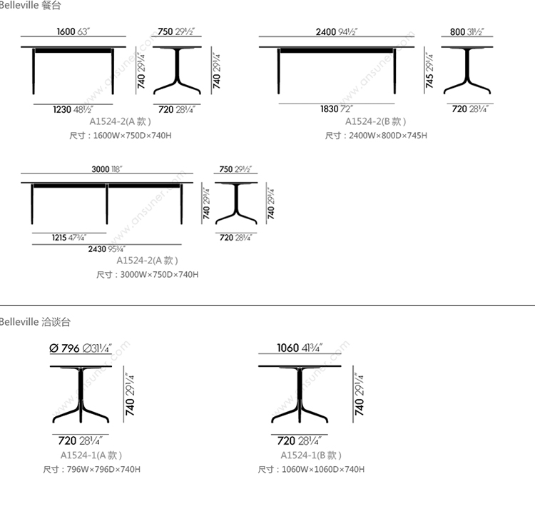 Belleville 餐台 系列尺寸/示意图