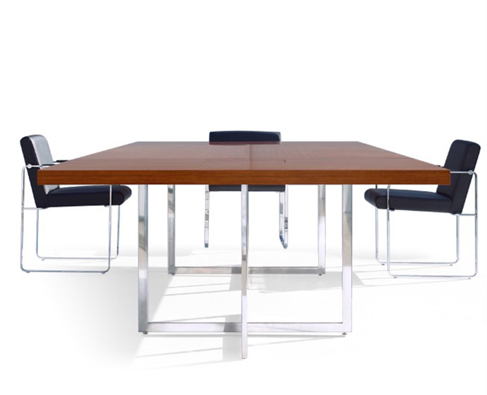 会议桌。50mm厚的一体式矩形顶部。抛光不锈钢结构底座。表面处理:木质饰面或微纹理漆面。金属底座采用抛光不锈钢制成。