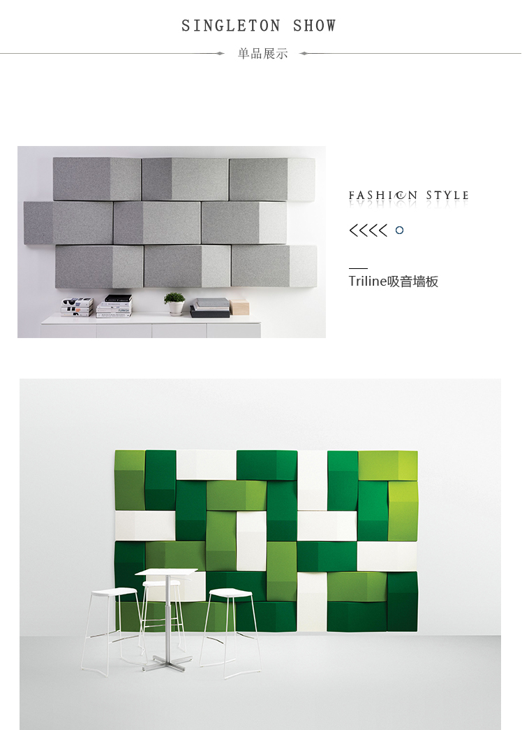 Triline Wall吸收并散发令人不快的声音反射,从而改善声学效果。由于模块具有直边,因此它们非常适合创建图案以覆盖大面积的墙面空间。每个模块包括安装在MDF板框架上的吸音再循环填充物。可见侧面采用羊毛织物装饰。该产品具有特有的三角形形状,可以打破击中模块的声波。由于采用隐藏式钢支架,产品可水平或垂直安装。