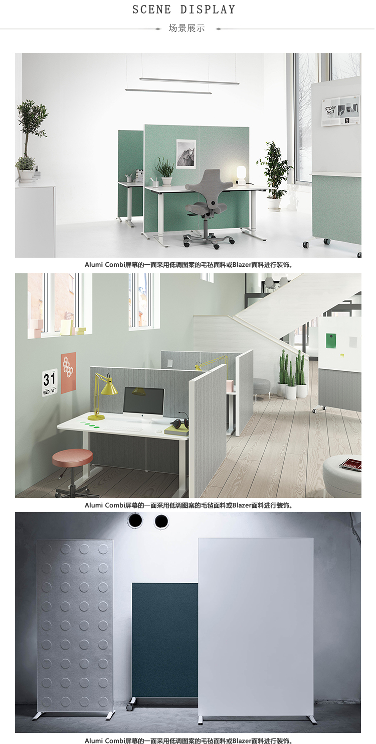 Nina Jobs设计了Alumi Combi和Alumi Combi Light,旨在鼓励同事随心所欲地召开会议。屏幕既可作为吸音器,也可作为书写板,安装在轮子上,便于携带。多功能书写板与Alumi系列中的其他吸音屏幕具有相同的低调外观,使它们能够和谐统一。