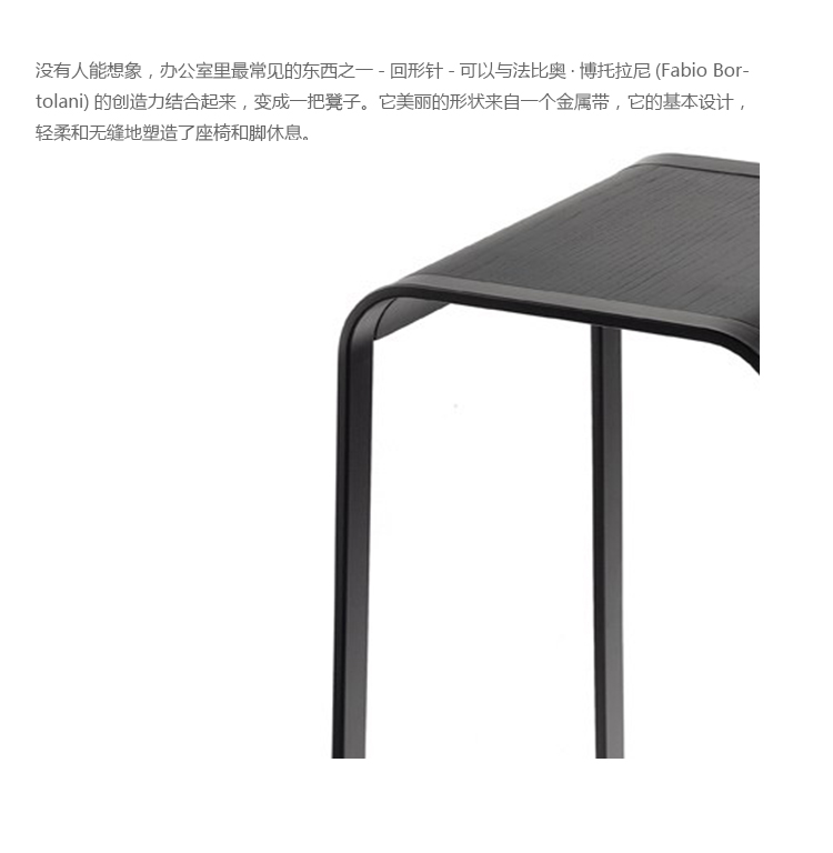 它自1899年发明以来从未改变过。没有人能想象,办公室里最常见的东西之一-回形针-可以与法比奥·博托拉尼(Fabio Bortolani)的创造力结合起来,变成一把凳子。它美丽的形状来自一个金属带,它的基本设计,轻柔和无缝地塑造了座椅和脚休息。