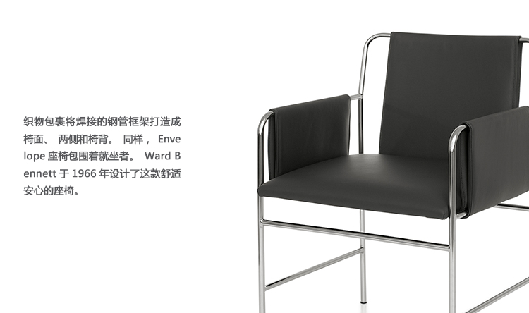 织物包裹将焊接的钢管框架打造成椅面、两侧和椅背。同样,Envelope座椅包围着就坐者。Ward Bennett于1966年设计了这款舒适安心的座椅。至今这款座椅仍然在生产。它既适用于公共场所,也同样适用私人空间,散发着永恒的美感。Envelope可以提供金属饰面、织物饰面、以及皮革饰面等多种选择。