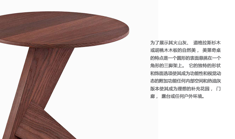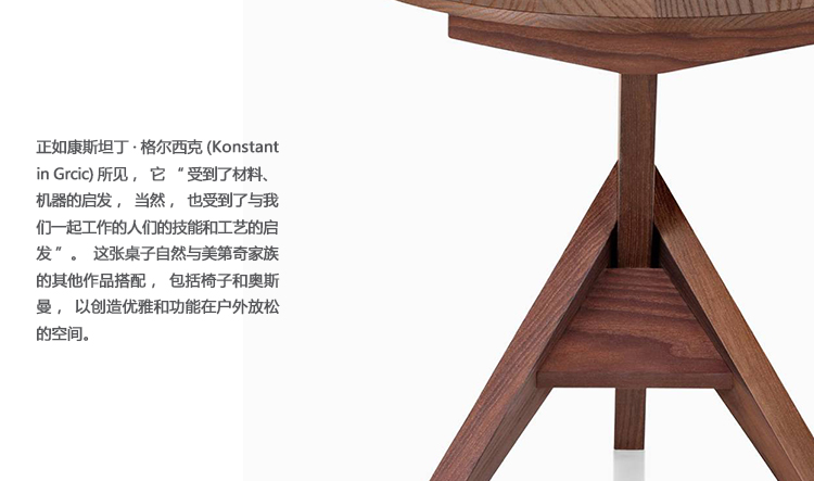 为了展示其火山灰、道格拉斯杉木或胡桃木木板的自然美,美第奇桌的特点是一个圆形的表面悬挑在一个角形的三脚架上。它的独特的形状和饰面选项使其成为功能性和视觉动态的附加功能任何内部空间和热油灰版本使其成为理想的补充花园,门廊,露台或任何户外环境。正如康斯坦丁·格尔西克(Konstantin Grcic)所见,它“受到了材料、机器的启发,当然,也受到了与我们一起工作的人们的技能和工艺的启发”。这张桌子自然与美第奇家族的其他作品搭配,包括椅子和奥斯曼,以创造优雅和功能在户外放松的空间。