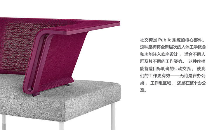 Public是首款支持非固定工作方式的办公系统,并且能在办公桌,流动空间以及团队区域内提供最大限度的舒适感,同时所有组件均纳入一致性设计理念。视觉上精致统一,模块化表面、储藏和座椅可根据您的需要采用各种配置方案,便于实现团队合作与个人工作的流畅转换。