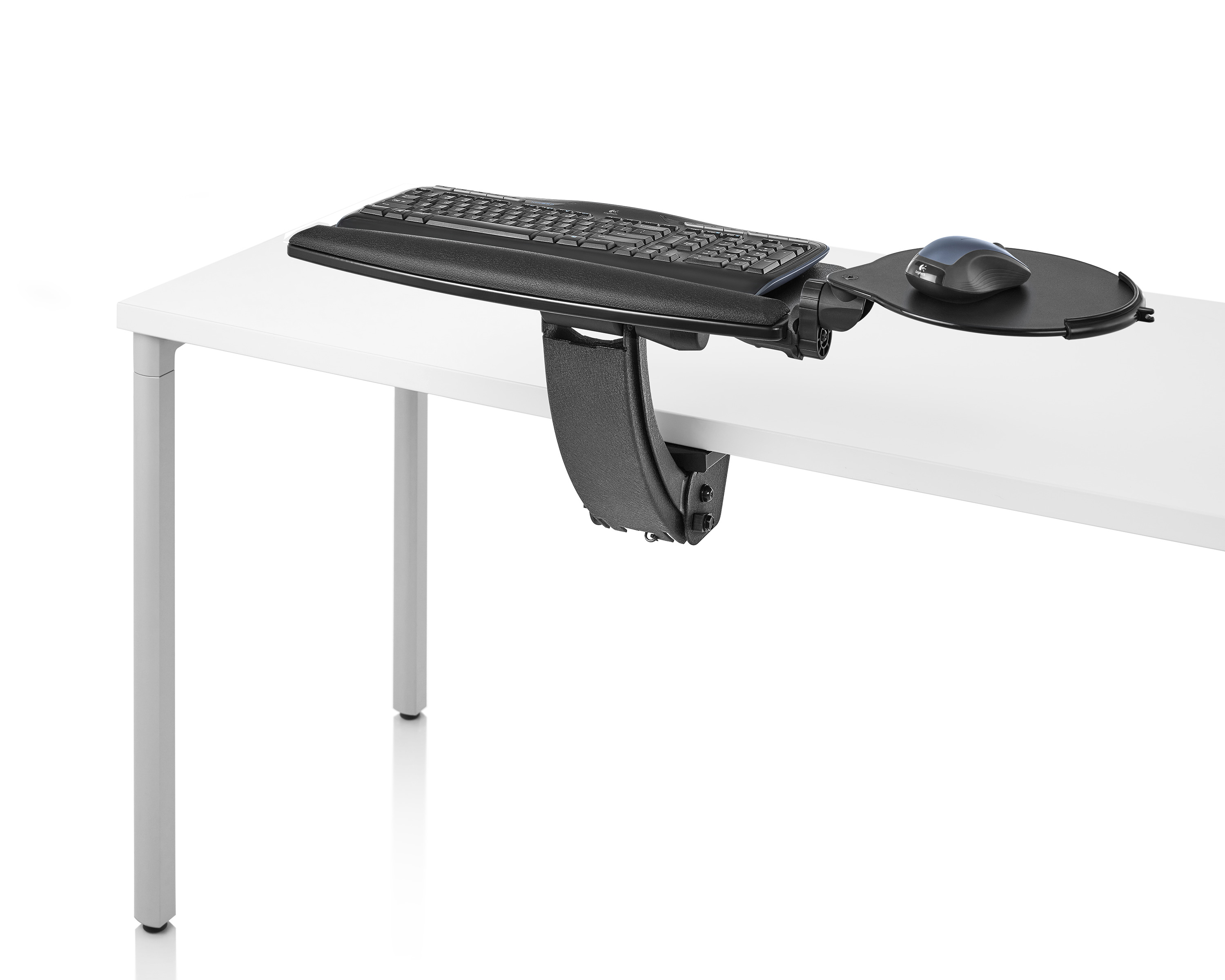 为了像你一样努力工作,我们的键盘支持连接到工作表面的底部,使你的键盘表面在适和你身体定位的高度和角度。高度和倾斜的调整范围很广,确保了所有人和家具的健康位置。当你需要打字的时候,机械装置就会伸出来,当你不使用时,机械装置就在工作表面下整齐的储存