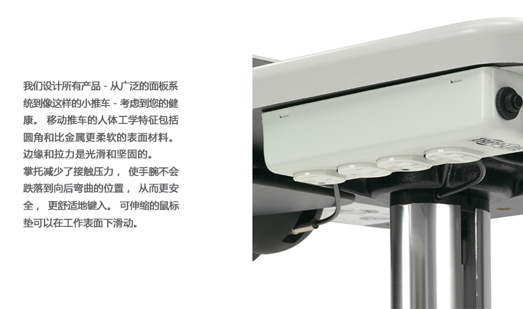 在赫尔曼米勒医疗,我们的目标是比任何人都更好地解决客户的问题。例如,把我们的移动技术车调节高度。我们认为他们提供最好的方法来简化工作区域之间的信息传递,和病人身边或其他点的护理。一个笔记本,一个用于平板显示器,键盘,和CPU。