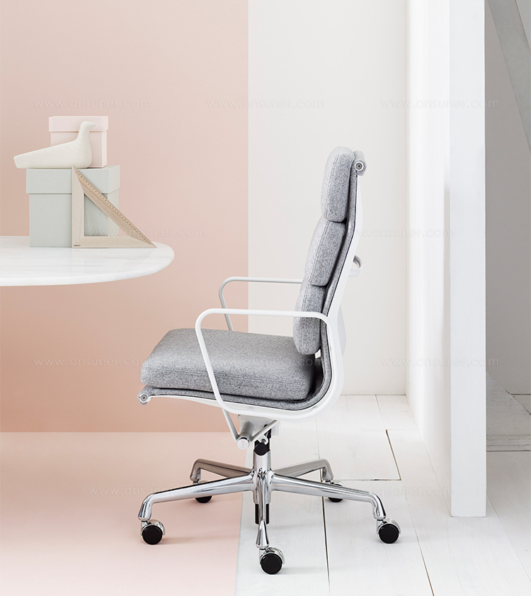 Charles与RayEames夫妇是20世纪最有影响力的设计师,卓越的设计涵盖了家具、建筑、影像与平面设计。他们从二次世界大战中美国海军的实验计画中学习经验并发展可谓是现今工业中使用模铸胶合版的先锋,这对设计界的超级夫妇档自1940年参与了由MOMA举办的有机家具设计大赛,自今已有近百件他们的作品被各大博物馆所永久典藏。Eames® Soft Pad Executive Chair(伊姆斯软包大班椅)是夫妻俩1958年设计的,是在全铝系列的基础上发展的另一系列Eames产品。舒适系列在全铝的椅架上增加了皮革制的柔软坐垫和靠背,高级铝合金制作,压模五星脚,可旋转。背垫和坐垫,采用西皮,具有透气性强,内部填充高密度定型绵,不易变形,不老化,依人体坐姿,符合人体工学,耐水及对人体无害等优势。椅子扶手选用优质电镀铝合金扶手,手感舒适,永久不生锈。转椅底盘为多功能底盘,可以保护使用者长时间坐用腿部健康,且作为高度可多定位调节。气压棒采用的气杆是正规厂家出产的外贸气杆,每一根气杆都有钢印,经过严格SGS检测的才可出厂,旋转、升降自如基本无声响,使用寿命长,可承受250kg,可升降数万次,将椅面调至与膝盖同高时,使用者坐下后双脚跟可垂直平放于地上,且大腿与地面平行,最符合人体工学理论,使用者长期久坐,也不想疲惫。办公椅脚为铝合金材质永久不生锈、承受能力强,安全更放心。椅子脚轮采用优质电镀片脚轮,耐用而美观,可以随意变换位置,贴心更方便,具有防震及防松脱,让椅子的安全性能更加可靠。