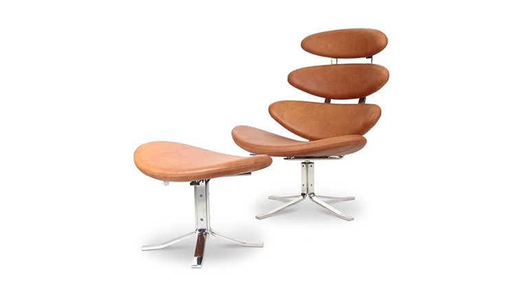 Poul M. Volther 于1964年的设计的王冠躺椅家具系列,是Poul M. Volther最知名的现代家具设计作品,此系列包括Corona Lounger Chair(王冠躺椅)、Corona Lounger Ottoman (王冠休闲脚踏)及其组合Corona Lounger Chair and Ottoman(王冠躺椅&脚踏)。历经40余年的今天,其作品在纷繁现代家具设计中仍占有一席之地。椅子充满了雕塑感,斯堪德维亚风格的简洁外形和舒适的坐感都是这张椅子成为创世之作的原因,四个椭圆形组成一张独特的椅子,无论摆放在哪,都令人过目不忘。此系列家具采用高强度钢材制作,表面电镀处理,外面为真皮或布艺制作,可360度旋转,不可后仰。适用范围广,酒店、会所、高档餐厅、夜总会、别墅等。