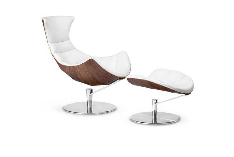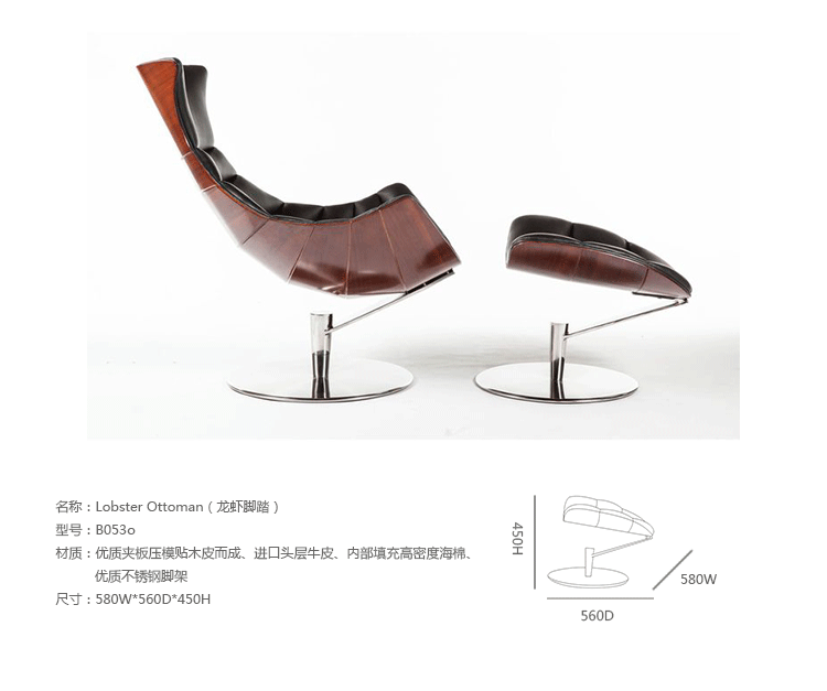 丹麦著名设计师Oluf Lund & Eva Paarmann设计的这款龙虾系列包含,Lobster Chair(龙虾椅)、Lobster Ottoman(龙虾脚踏)及组合搭配Lobster Chair and Ottoman(龙虾椅&脚踏)。此款椅子造型就像一只龙虾,采用优质夹板压模贴木皮而成、进口头层牛皮、内部填充高密度海棉、优质不锈钢脚架制成,简约立体的流线融入符合人体工学及空气动力学的结构设计,摆脱传统办公椅单调冷硬的刻板印象,达到舒适久坐的基本需求。