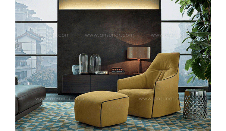 "The Santa Monica Lounge armchair,characterized by a unique design,is a project conceived by the French designer Jean-Marie Massaud,and it is produced by Poliform,a leading company in the made in Italy furniture manufacture.The Santa Monica Lounge armchair on sale in our showroom is matched with the Santa Monica ottoman.Both the items are covered in fabric,yellow colour,with iron coloured stitches."