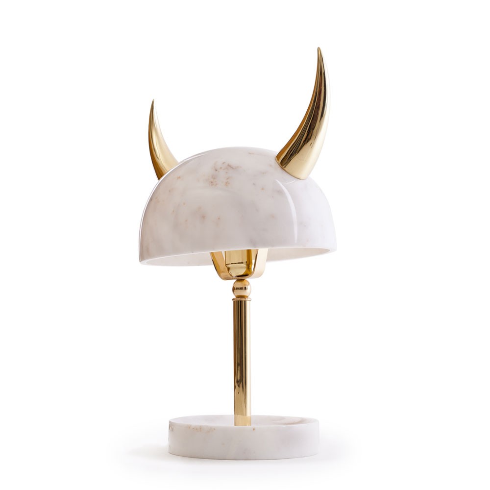 “Min Lilla Viking”(My Little Viking)台灯向老式斯堪的纳维亚战士头盔致敬。 它与现代风格的形状和风格相呼应。 金属盔甲和骨头已被大理石和抛光黄铜所取代,使这种野蛮的象征更加优雅。 当点燃时,Carrara和Afyon大理石通过揭示类似行星的石头的丰富自然纹理使观众感到惊讶。 “Min Lilla Viking”是将在不久的将来发布的一款严肃的漫画台灯中的第一款。