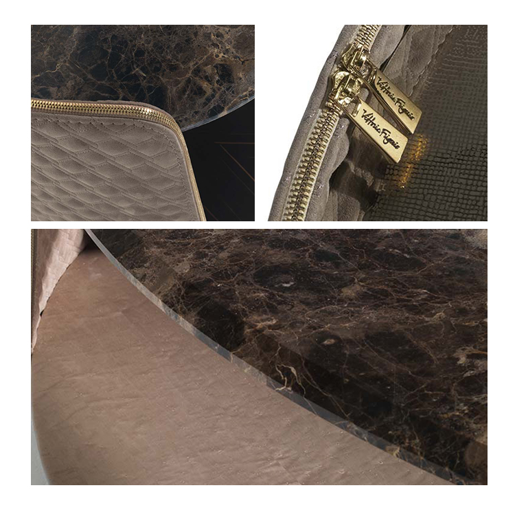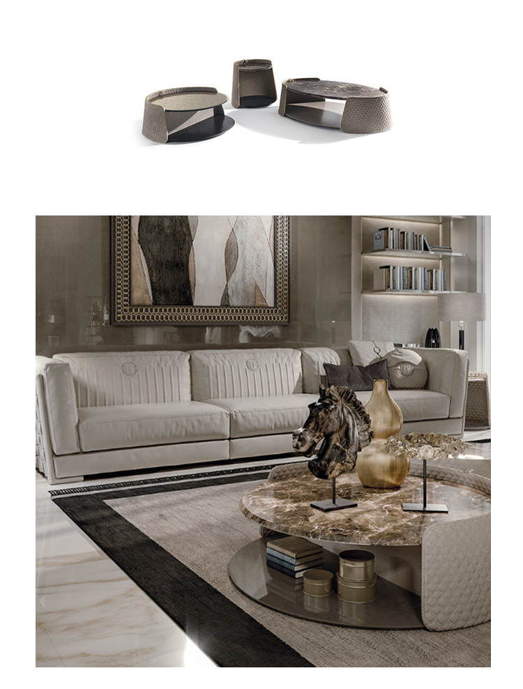 La combinazione della struttura in metallo ricoperto in materiale ricamato con il piano in marmo o in specchio, rende questi tavolini dalla forma arrotondata articoli di alto design.