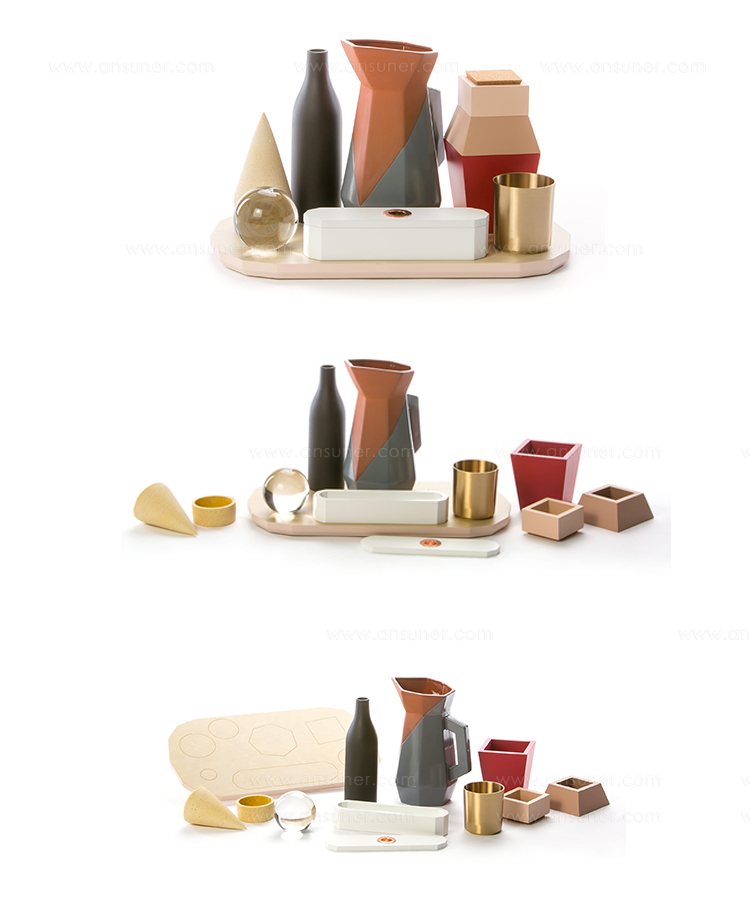 桌面集由一组对象组成,其特征在于使用不同的材料来创建不同的使用形式。 木材和软木的自然性与聚乙烯的当代性质相对应; 陶土的质地与玻璃和瓷器的精致混合。 具有几何形状和温暖的柔和色彩的花瓶,容器,玻璃和镇纸组合成功能性和装饰性。 桌子采用休闲和俏皮的色调。