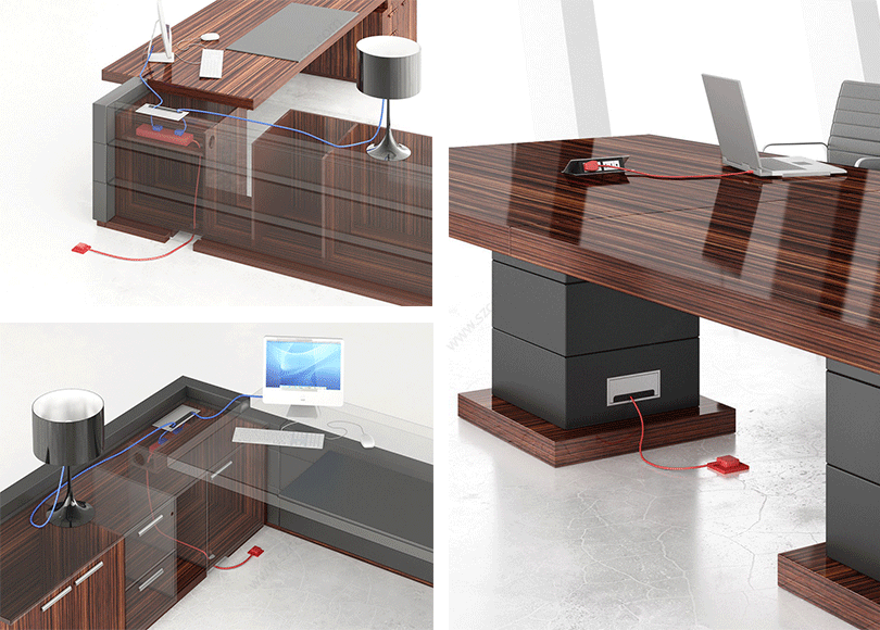· 班台分内外侧隐蔽式走线通过副台底板和侧板进线口连接地插,实现进线完全隐藏,台面电器可直接打开台面走线盖连接电源,实用方便、灵活,