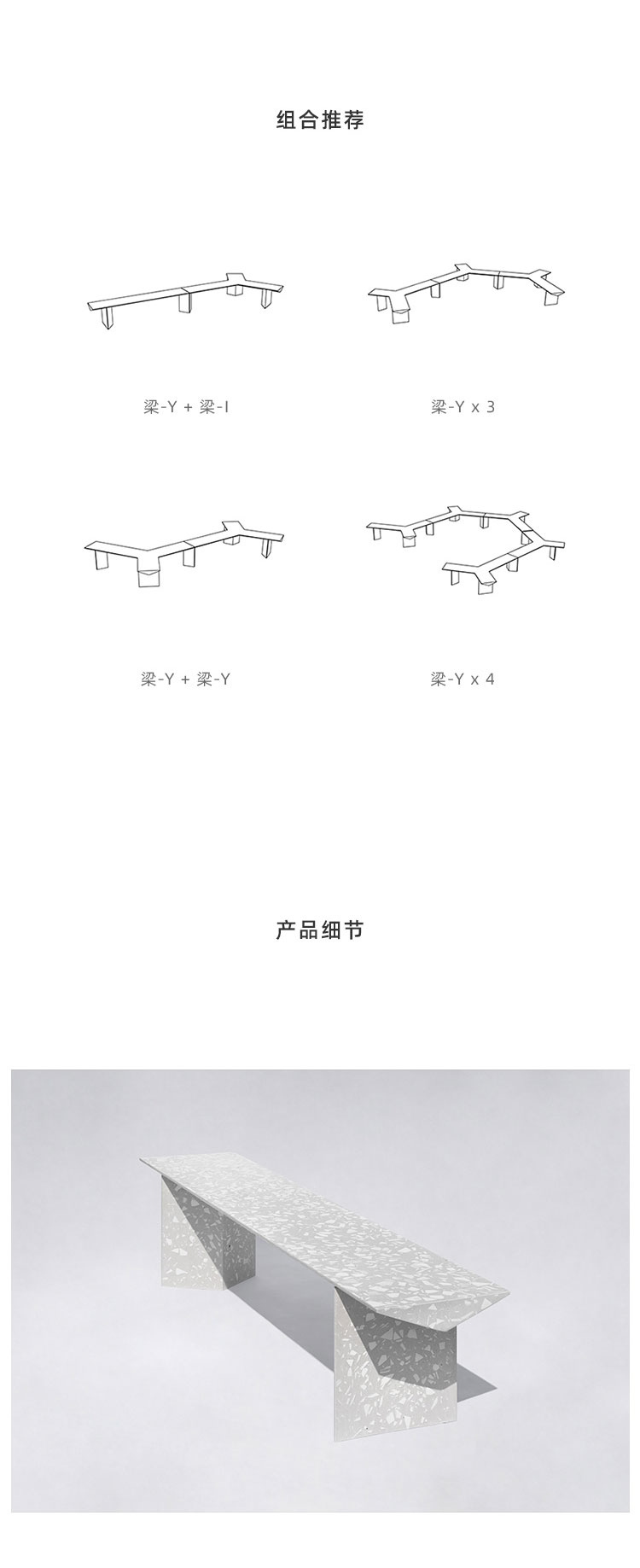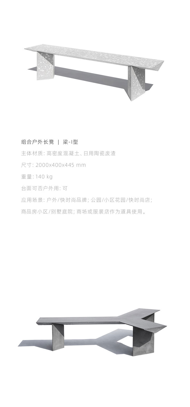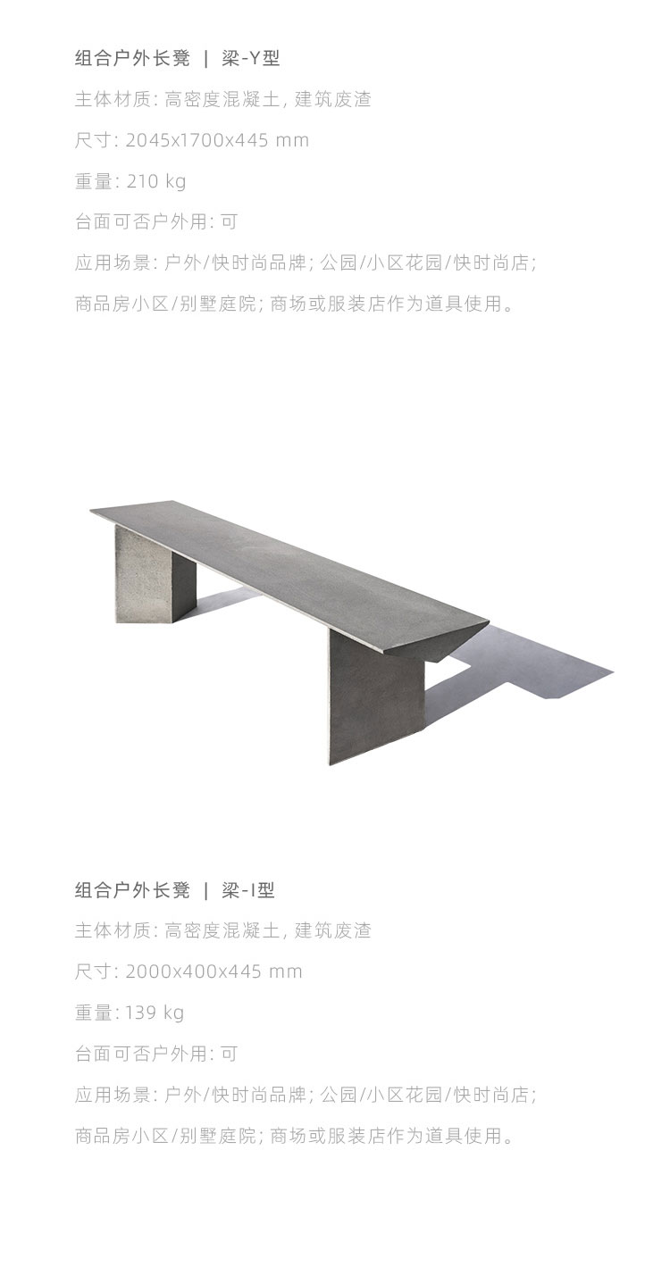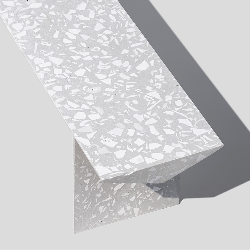 『梁』组合式户外长凳是一款回收应用日用陶瓷废料的混凝土公共家具,它提出一种积极、平实、极具社会性的『可持续化』日常。 将中国本土庞大的日用陶瓷废料存量引入材料开发应用中,替代天然大理石骨料,经济环保;而陶瓷废料的原本形态被转化为产品独特的视觉语言,更显真实自然。
