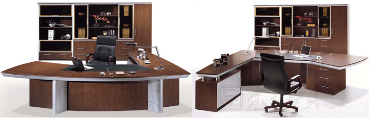 ※  图为至尊班台不同角度展示图片,匹配于富品味的行政人员办公室,这木制行政人员工作间包括飞旋鏢型的桌面相连简单会议桌面,底部由哑面金属小圆柱承托,桌边的双色对比烘托出桌面、储物框架及地柜的相互协调;宽大的桌面配以书写垫内藏线缆储存空间及一边抛出形的会议桌,前面的曲尺间隔板令整体美观划一,小巧的侧桌底座则为卷门式的地柜,既提供储物用途又能节省空间,小型文件柜有三抽屉、但抽屉及掩门柜以收藏电脑主机。