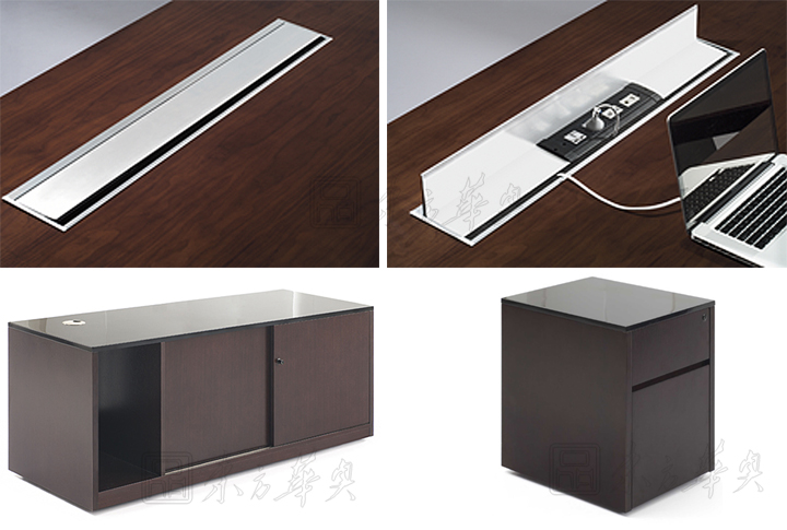 ※ 班台的过线系统介绍:此款班台可以选择如图的手动线盒、电动线盒、以及毛刷翻盖线盒,适合你不同的办公需要,内部可配置动功能三插电源孔、网络接口、耳机音频接口、话筒接口、VGA接口,也可根据客户实际需要选择和定做。