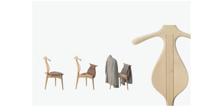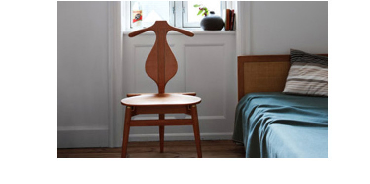 The Valet Chair(侍从椅),1953年设计,是Hans J. Wegner的经典代表作之一。这把椅子是Hans J. Wegner同建筑师 Steen Eiler Rasmussen 和设计师 Bo Bojesen 聊天谈到就寝时折叠衣服的麻烦,他就做了这个有趣的设计,为了让它看起来不笨重,从4条腿减到3条。靠背两侧选用对称的木纹,木纹的机理是整个靠背有机曲线的补充。椅子看起来像一把提琴,又像一个穿着燕尾服的侍从,不但具有美感,而且很具实用性。