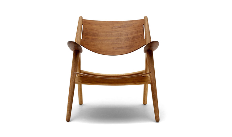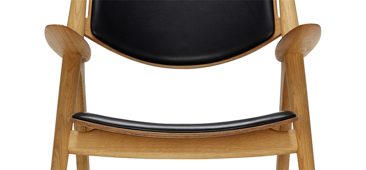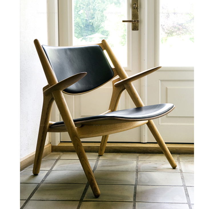 "Hans Easy Chair(汉斯简易椅)设计于1952年,2007年重新生产,是Hans J. Wegner的杰作之一。椅子的独特的造型腿形也是它最鲜明的特点。另外宽阔的扶手和较低的座板靠背都增加了这把椅子的舒适性。椅子可提供纯水曲柳实木框架、靠背曲木弯板版,也可添加织物或皮革坐垫及靠背。"