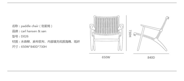 Paddle Chair(划桨椅)设计于1950年,是Hans J. Wegner的杰作之一,Carl Hansen生产,代号CH25,椅面和靠背都是绳线编制,其所用的绳线甚至超过400米,可提供自然色或者黑色。时尚经典的Paddle Chair(划桨椅)适用于任何房间。
