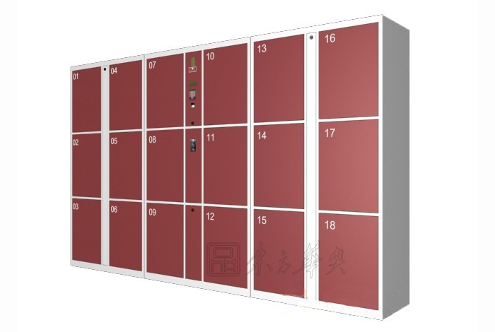 寄存柜柜体选用优质冷轧钢板,厚度不小于1.0mm,经冷加工成形后,用二氧化碳气体保护焊焊接装配而成,柜体结构坚固结实。柜体表面经除锈、除油、打磨、磷化处理后喷塑(不接受喷漆)。箱门背面增加纵向加强筋,提高箱门的防撞击能力。箱门两侧呈一定角度的弧线外形,增强箱门的防撞击能力,并且有效防止使用者因疏忽碰伤、磕伤。电控锁采用棘爪式结构,360度防撬、防插。