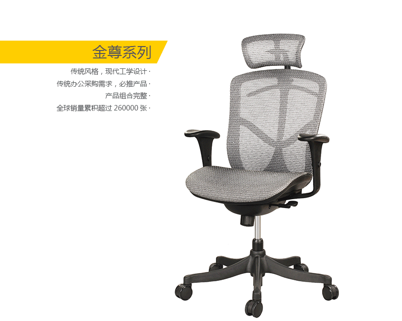 金尊的唯美设计有利于持久的舒适和美感。人性工学椅的结构和功能利用同步倾仰底盘控制功能锁定,滑座和高度调节。高度和角度均可调的扶手和头枕都包含在这张独一无二的工学椅里。