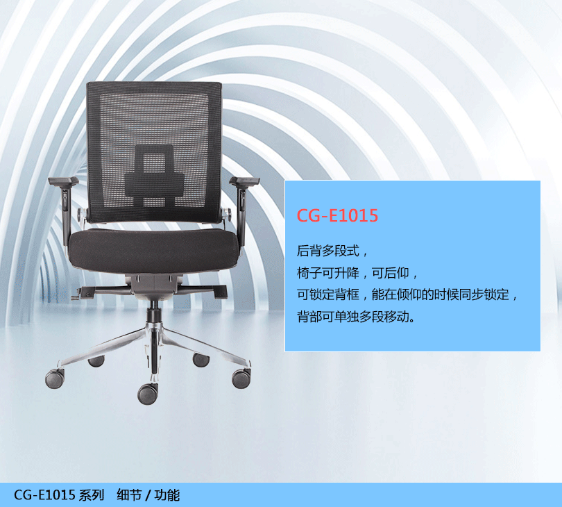 CG-E1015办公椅是一款符合人体工学的全功能性办公椅,力求使用者能充分理解其人性化的设计及达到最舒适的调节。