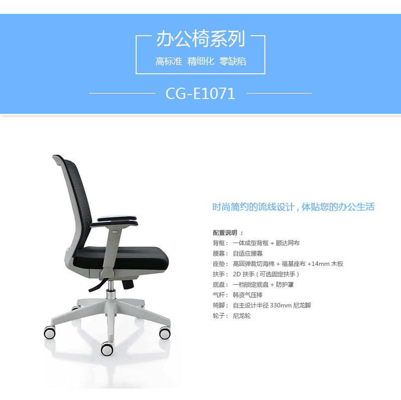 CG-E1071办公椅是一款符合人体工学的全功能性办公椅,力求使用者能充分理解其人性化的设计及达到最舒适的调节。