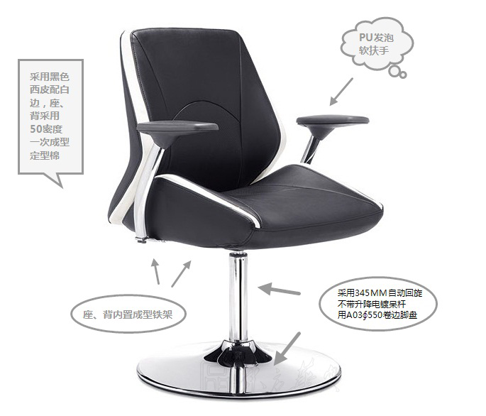 A:采用黑色西皮配白边,座、背采用50密度一次成型定型棉,座、背内置成型铁架