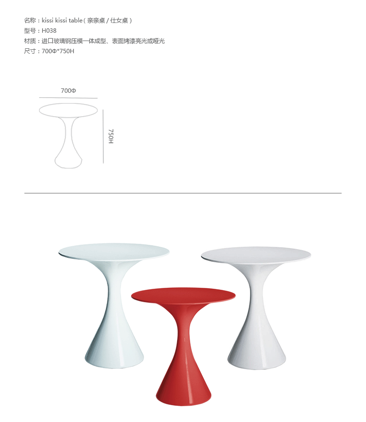 Kissi Kissi Table(亲亲桌仕女桌)是意大利米兰著名家具设计师Miki Astori设计的一款时尚经典的桌几。这款圆桌造型轻巧,无锐角圆弧造型,曲线细致,有如一位窈窕淑女。本品采用聚乙烯塑料材质,室内外都可以使用。