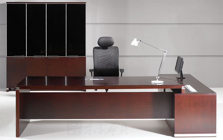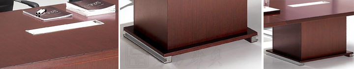 ※ 系列配套大班台展示图,方正造型,台面和台脚采用凹形铝合金饰边,形成厚与薄,深与浅的对比视觉,简约而经典。台面木纹采用横纹方向,正是欧美流行设计。