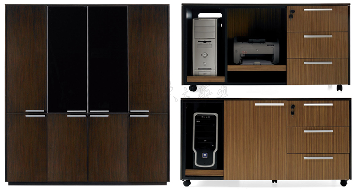 ※ 附柜薄边设计,有单门空格,单门三抽,单门带抽拉式打印机主机空格,单门三抽带主机空格,双门三抽等结构形式,顶板可开设多功能线盒,以适应不同文件储存及办公自动化需求