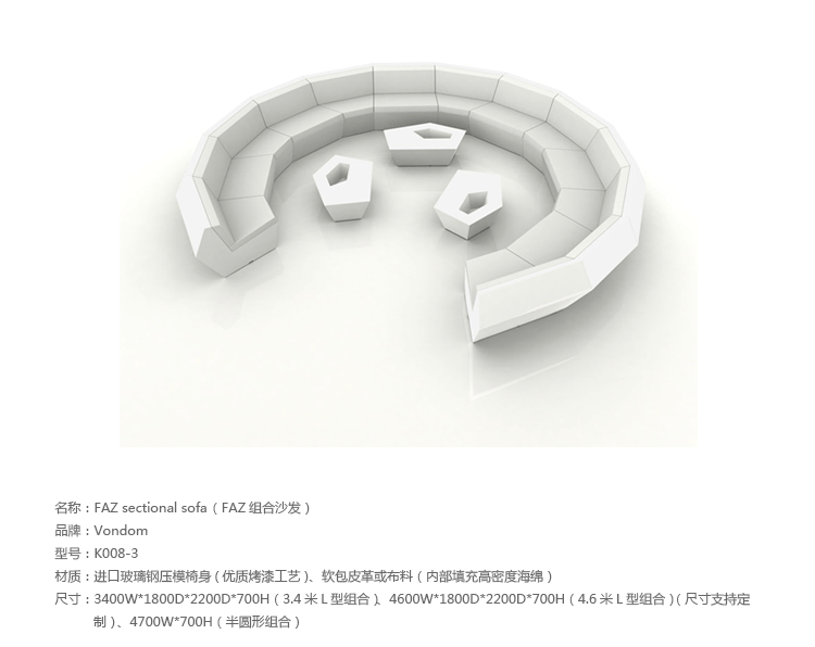 FAZ是西班牙著名建筑师Ramon Esteve为VONDOM公司设计的组合家具和花盆系列。Ramon Esteve是和谐的,平静的和永恒的建筑师,创造了一个矿物质的,表现力丰富的形状,;令FAZ跟我们的家或其他环境完美融合。气氛,包围的结果是材料和光线元素幸福的组合,其独特的察觉是气混合体。他们的灵魂,VONDOM,他的独家性是他原材料的品质,允许,甚至在最苛求的环境使用。FAZ的组合性允许消费者灵活的组合他们的家具和花盆,来适应他们的风格,但并没有失去这家具系列的和谐。FAZ,由辅助桌子,扶手椅子,组合沙发和咖啡桌子,还有三个不同比例的花盆组成。这个系列还配套了最优质的户外坐垫。FAZ,他的结果是表现本质,包含复杂性和密度性,直到极端细节的杰作,其目的是创造一个我们向往的居住地。