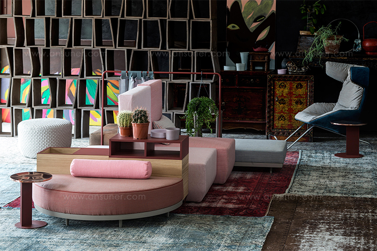 设计相互作用,轨迹控制空间。比基尼是一种风景,它是时代的产物,是它所代表的社会。无论是在等候区还是在家中使用,座位系统是绝对灵活的,因为不需要空间的布局和座位组件的排列。这些组件在外观和功能上各不相同,因此,它们可以在任何设置中使用。凳子、桌子、衣架、容器、架子、屏风、工作台、座椅:每一个元素都结合在一起,创造互动和交流。多种功能和含义的结合意味着沙发作为看电视的家具或简单的休息场所的概念发生了革命性的变化,使它成为互动的核心。