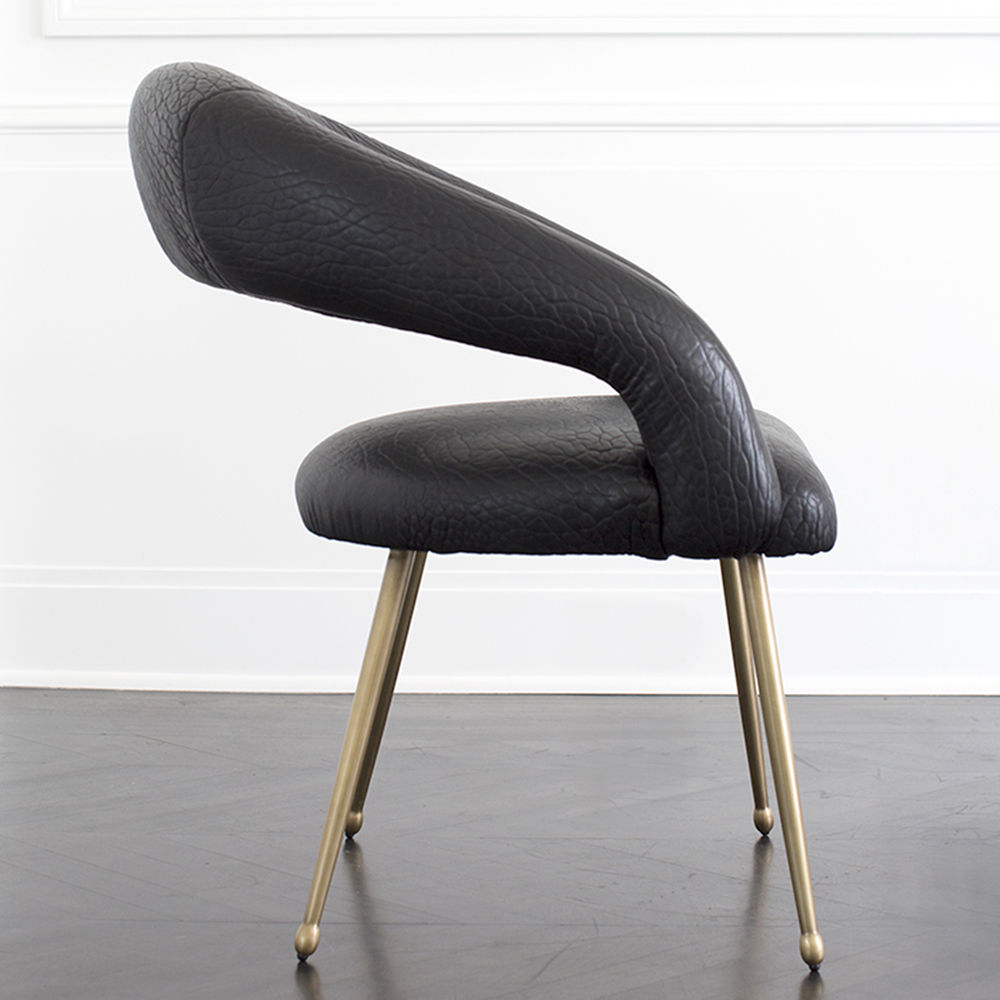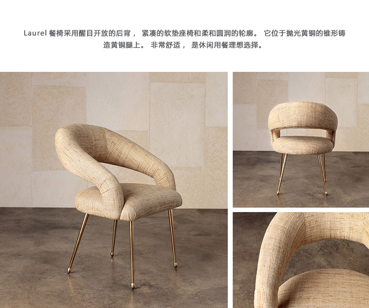 Laurel餐椅采用醒目开放的后背,紧凑的软垫座椅和柔和圆润的轮廓。 它位于抛光黄铜的锥形铸造黄铜腿上。 非常舒适,是休闲用餐理想选择。 提供精选面料和皮革。