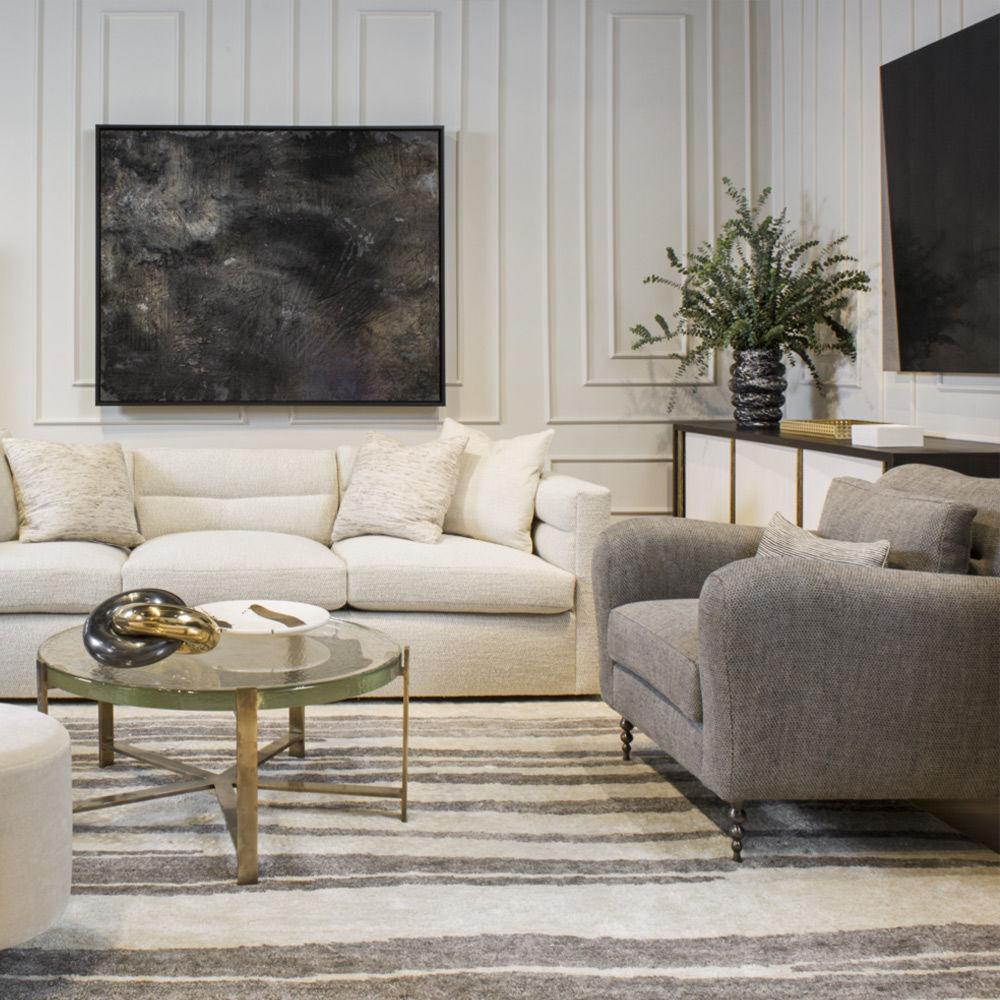 这款经典的扶手沙发采用柔软弧形靠背设计,整个过程中都有标志性的定制通道细节。 三个松散的靠垫和三个座垫使用10/90混合的鸭绒和羽毛,以延长寿命和极致舒适。 腿部采用低嵌入式木结构,使轮廓能够漂浮在地面上方。 硬木框架采用双向榫钉,配有8向手动弹簧,经久耐用,性能卓越。