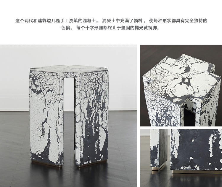 这个现代和建筑边几是手工浇筑的混凝土。 混凝土中充满了颜料,使每种形状都具有完全独特的色偏。 每个十字形腿都终止于坚固的抛光黄铜脚。 每张桌子的一面都印有Kelly Wearstler标志。