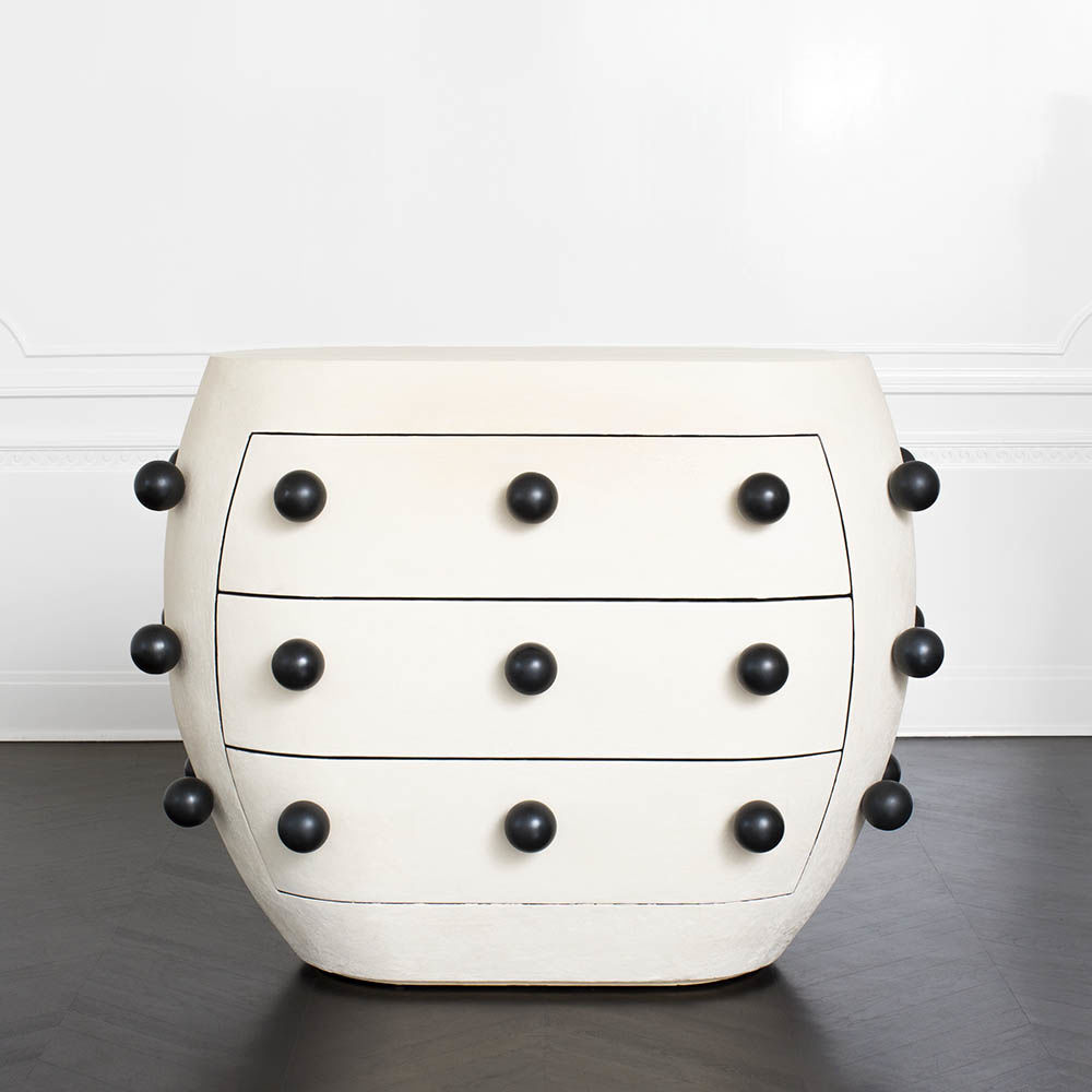 Pop柜子从凯利对对比材料的热爱中汲取灵感,并突破了形式和功能的界限。 这个三抽屉柜子的外部覆盖着一个独特的象牙手工抹平的石膏,并点缀着黑色的不锈钢球体。 这款对比色的黑檀木橡木,使其成为优雅存储的高功能选择。