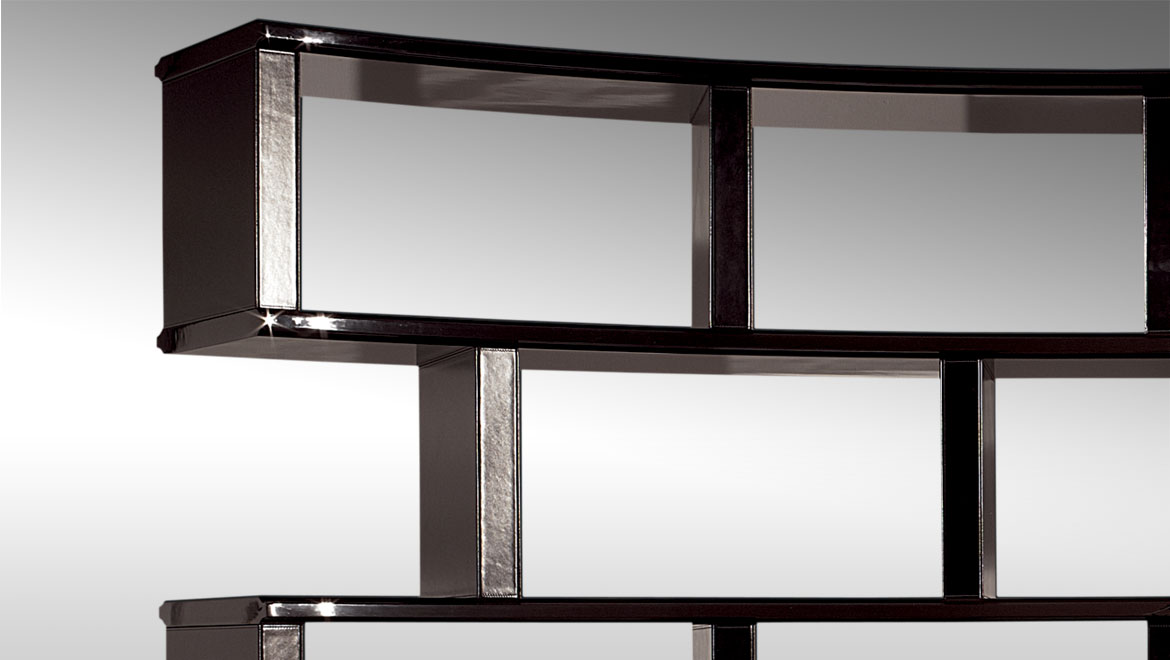 Glossy lacquered wood with leather details