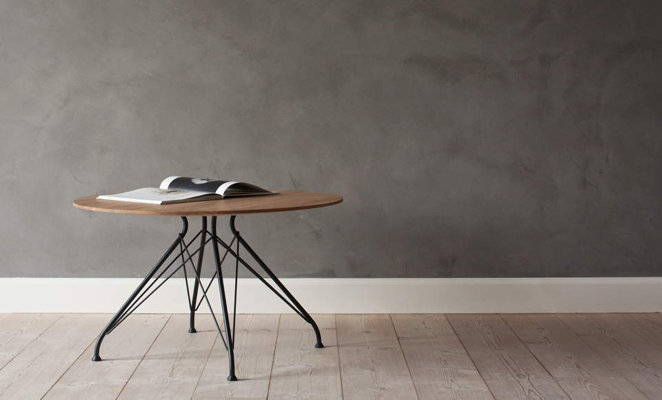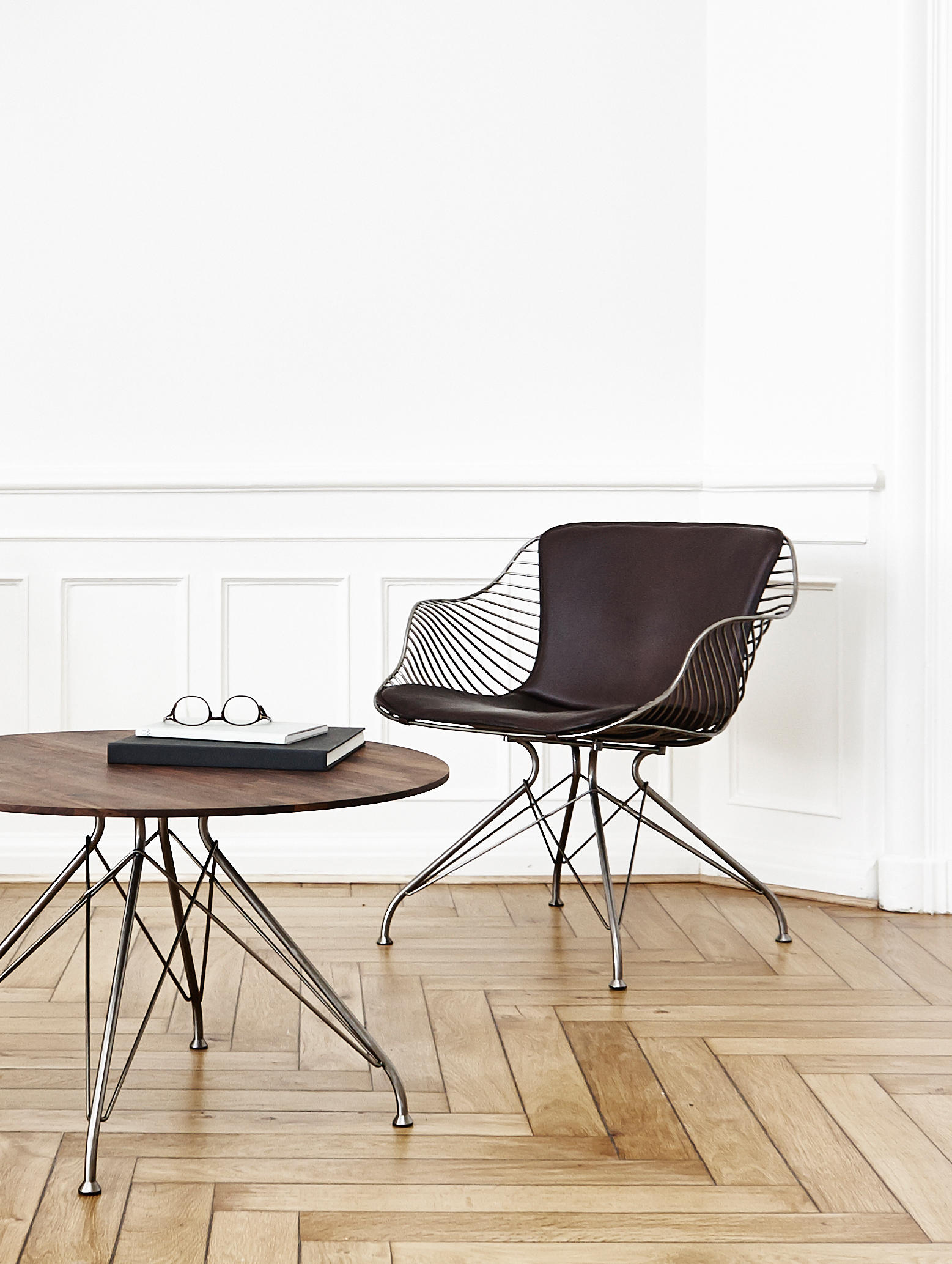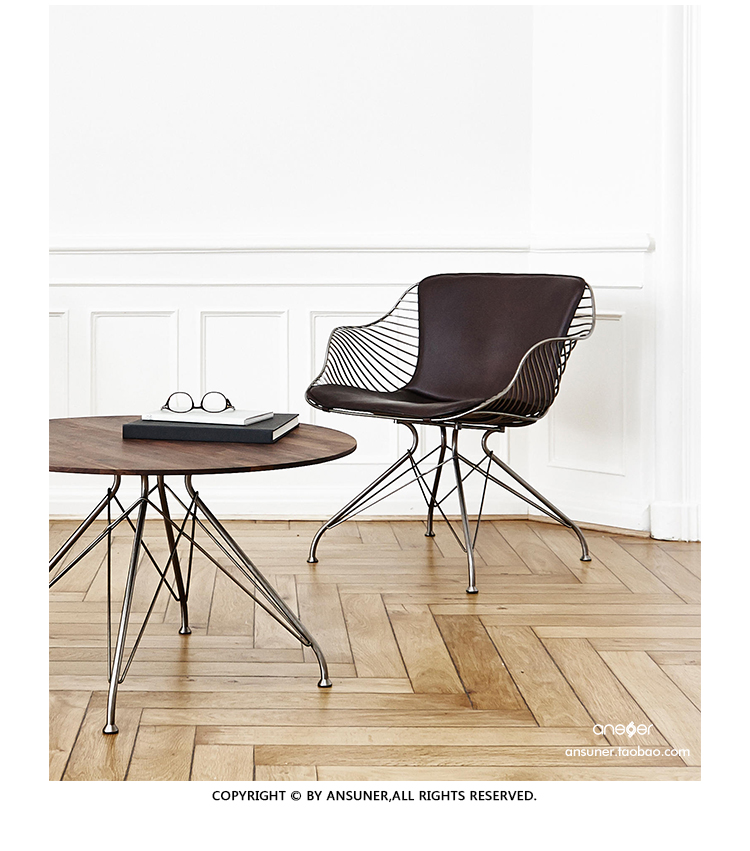 金属丝茶几由Jasper Overgaard和Christian Dyrman设计。2014年设计的金属丝躺椅是一种更低、更宽、更平放的版本,与铁丝餐椅相比。