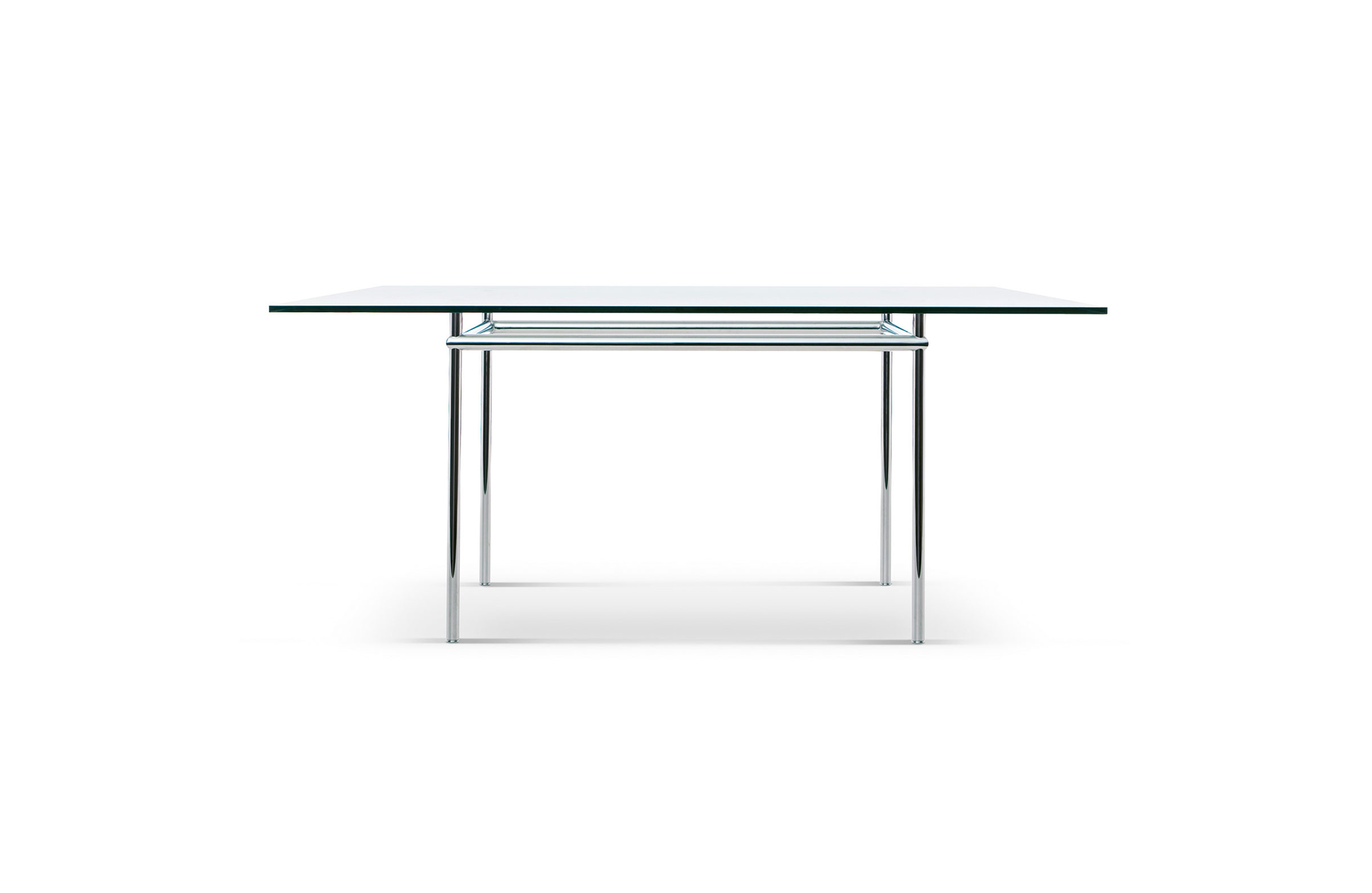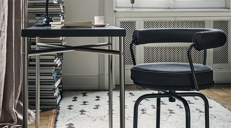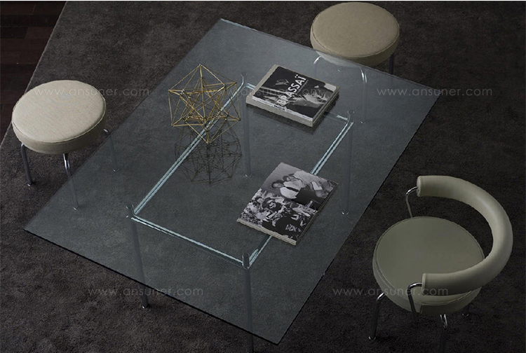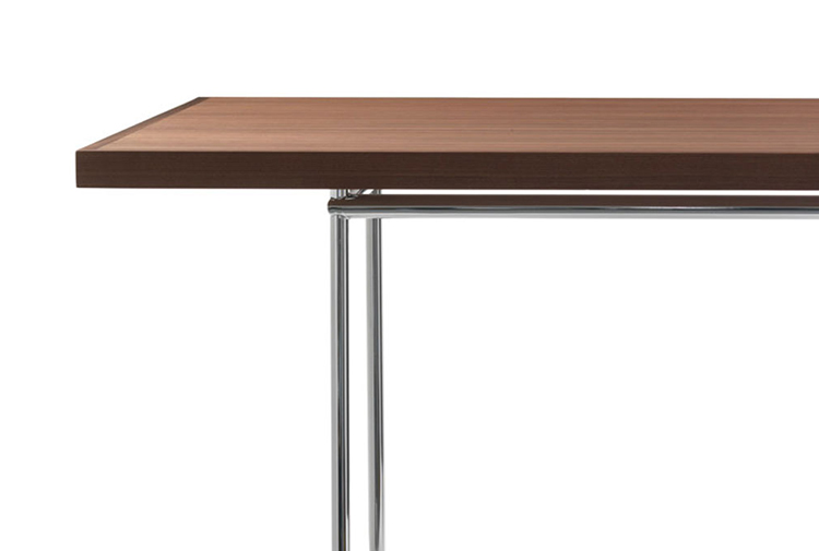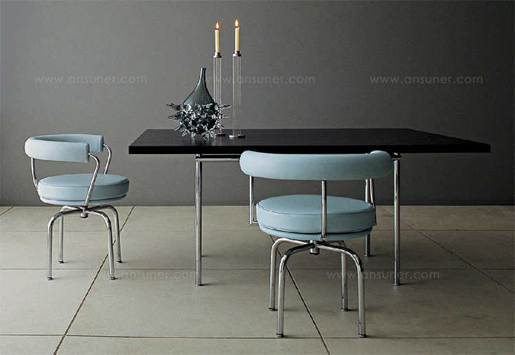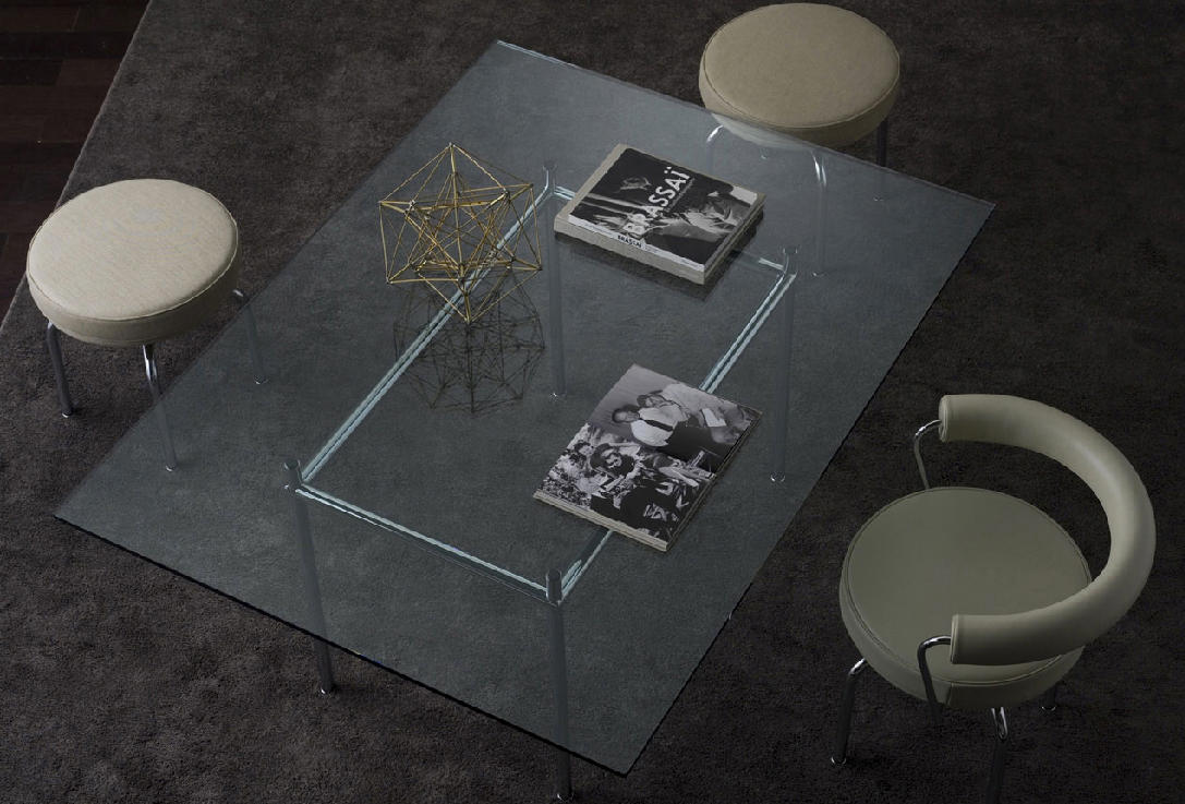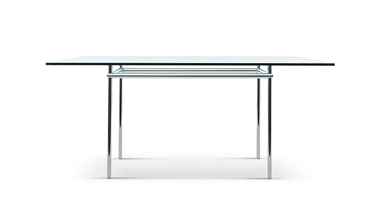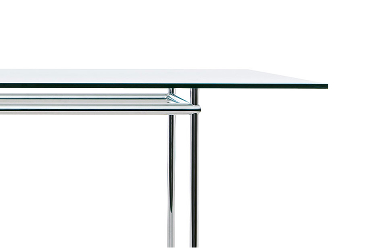 矩形桌,采用CR3三价镀铬钢结构或浅蓝色哑光珐琅钢架。桌面选用50mm厚的胡桃木或15mm厚的晶质或网纹玻璃。有2种尺寸的矩形桌面可供挑选:160x120 cm或120x80 cm,这款于1925年为La Roche House设计的桌子为不同位置带来了解决方案。他们的精髓在于支撑和被支撑两个元素之间的比例对比,也就是说:垂直形状的桌腿的最低宽度以及水平方向桌面的最大宽度。Le Corbusier的其它设计中也强调尺寸关系的对比,确认存在塑料诗意的优点,普遍通过元素角色反演、桌面与实际重量的振动大小以及桌腿与视觉精美的舒适稳定度进行表达。