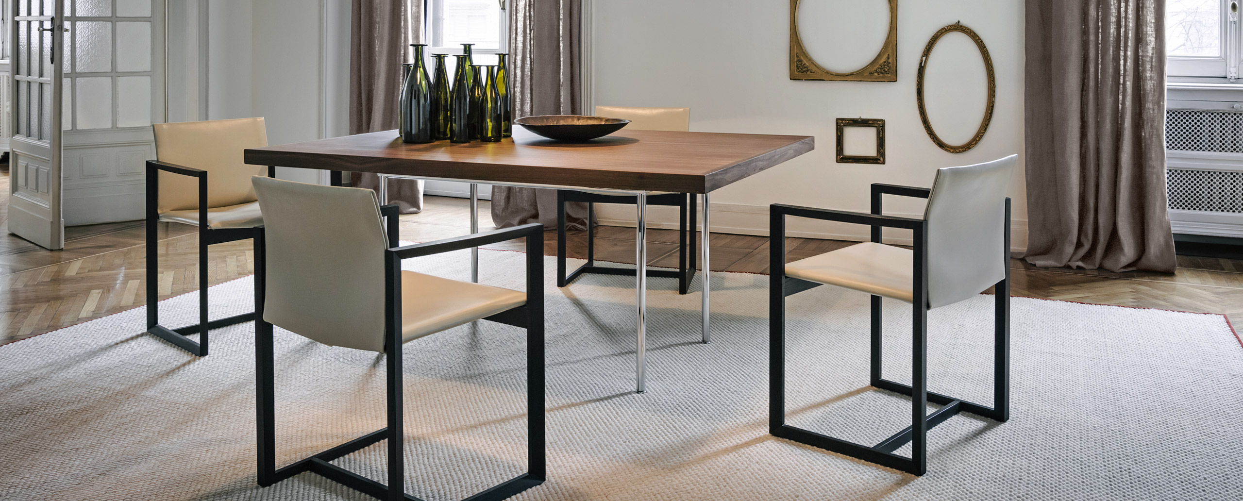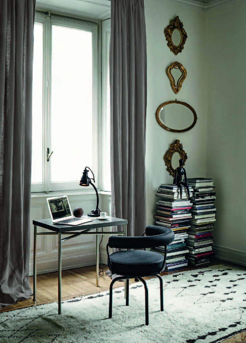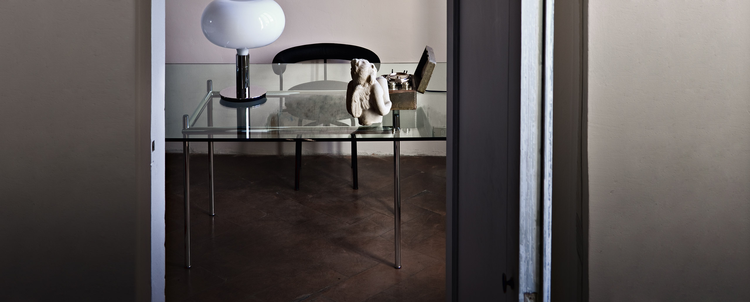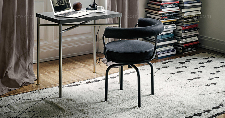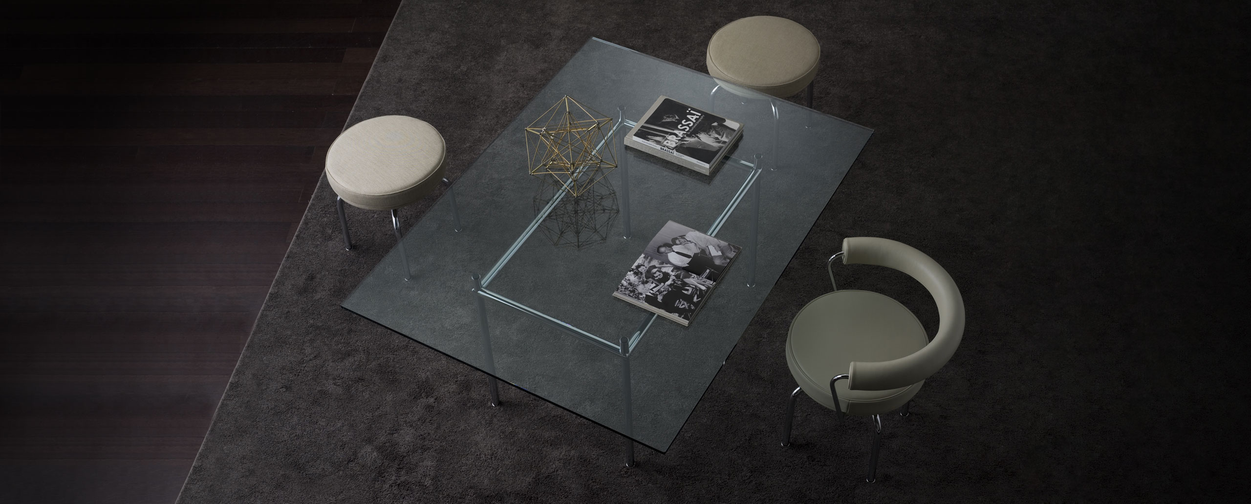 矩形桌,采用CR3三价镀铬钢结构或浅蓝色哑光珐琅钢架。桌面选用50mm厚的胡桃木或15mm厚的晶质或网纹玻璃。有2种尺寸的矩形桌面可供挑选:160x120 cm或120x80 cm,这款于1925年为La Roche House设计的桌子为不同位置带来了解决方案。他们的精髓在于支撑和被支撑两个元素之间的比例对比,也就是说:垂直形状的桌腿的最低宽度以及水平方向桌面的最大宽度。Le Corbusier的其它设计中也强调尺寸关系的对比,确认存在塑料诗意的优点,普遍通过元素角色反演、桌面与实际重量的振动大小以及桌腿与视觉精美的舒适稳定度进行表达。