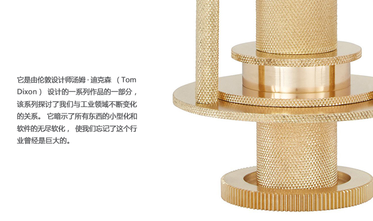 Cog是一个烛台,有两种大小,是由滚花盘,锥,棒和齿轮制成的。尽管不是在英国制造的,但它笔直而真实地证明了伟大的英国工程时代。讽刺的是。从固体铝,然后黄铜镀,它的表面重量掩盖了它的重量。这是一个系列的一部分,伦敦设计师汤姆·迪克森(Tom Dixon)的作品,探讨我们不断变化的关系与工业景观。它暗示着一切事物的小型化,以及器皿的无止境的软化,使我们忘记了工业曾经是巨大而不妥协的,吵闹和喷涌,其残酷的美丽令人恐惧,同时也是现代信息时代的先兆和先驱者。人们想了很多,但说的还不够多,汤姆·狄克逊的确是这样的聪明。
