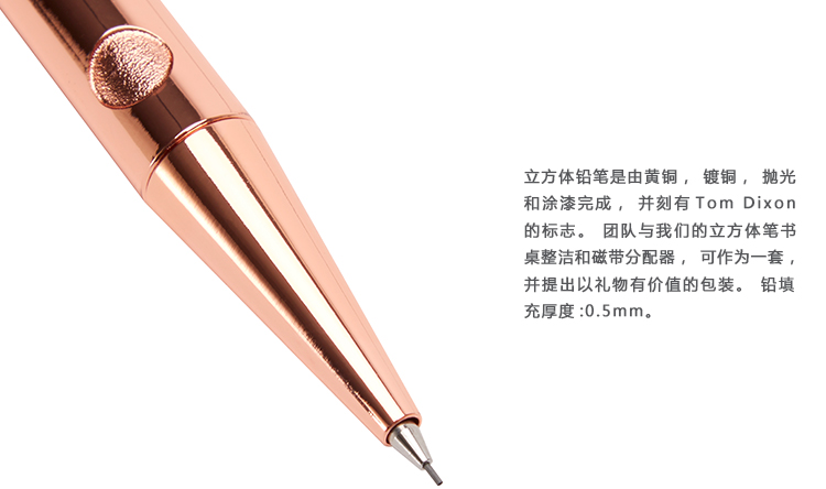 立方体铅笔是由黄铜,镀铜,抛光和涂漆完成,并刻有Tom Dixon的标志。团队与我们的立方体笔书桌整洁和磁带分配器,可作为一套,并提出以礼物有价值的包装。铅填充厚度:0.5mm。