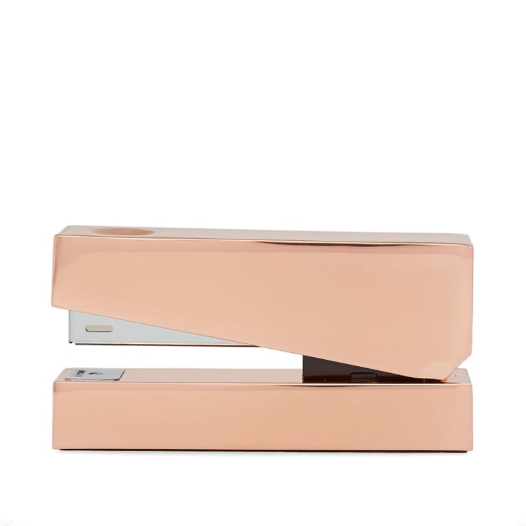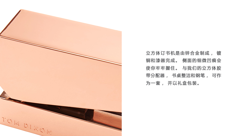 立方体订书机是由铝合金制成,镀铜和漆器完成。侧面的细微凹痕会使你牢牢握住。与我们的立方体胶带分配器,书桌整洁和钢笔,可作为一套,并以礼盒包装。